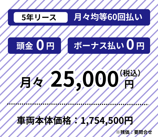 なお残価等の詳細についてはスタッフにお問い合わせください。●取扱リース会社によっては価格が異なる場合がこざいます。